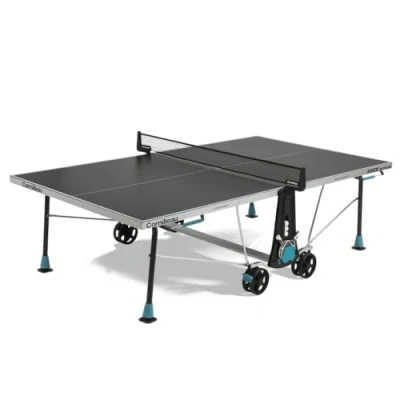 The Cornilleau Sport 300X is a sturdy rollaway outdoor table tennis table ensuring excellent fun for friends and family members. This full-size, weatherproof table is resistant to sun, rain, snow, and frost thanks to its 5mm resin laminate playing surface delivering consistent speed and bounce. It has Soft MAT Top® anti-glare coating and a tough 50mm (2') corrosion and scratch-resistant steel frame making the table both durable and stable. For a level playing surface, there are ø38mm (1.5') straight legs with adjustable feet, whilst a playback position allows for individual training. The 300X is approved by the FFTT (French Federation of Table Tennis) for leisure use and offers foldable posts and a tension adjustable polyethylene net. The table is wheelchair friendly and features storage for 4 bats and 4 balls, as well as colour coordinated retractable scorers to help you keep track of the game. The Sport 300X ensures safe and space-efficient storage due to two foldable halves and 4 heavy-duty twin wheels (2 with brakes) making it easy to move around. Additionally, there is DSI locking system with 16 locking points for a secure placement in a storage and playing position.