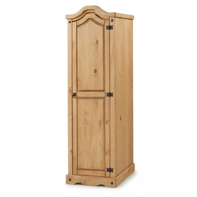 General description The Corona 1 Door Wardrobe is expertly crafted from solid pine and hand waxed to enhance the grain. It features a single door, making it a practical addition to any bedroom. Finished with black metal fittings, it showcases distinctive Mexican styling and rustic country charm. The wardrobe has hardboard backs and is delivered flat packed for easy home assembly with step-by-step instructions. Technical specifications Height: 176 cm Width: 55 cm Depth: 45 cm