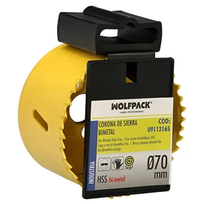 Dimensions: diameter 70 mm. Made of alloy of high hardness and wear resistance. Thermally hardened teeth, which gives it great stability at the cutting edges. Reinforced crown base. Side holes for chip evacuation and better cooling. Ideal for making orifies of mild steel, cast iron, brass, aluminum and wood. Item known as wood drill, wood drill, wood saw, wood saw, wood hole saw. Bi-metal saw Ø 70 mm tempered thermoplastic, reinforced base, wooden crown, drill holes in wood, steel, iron, plastic