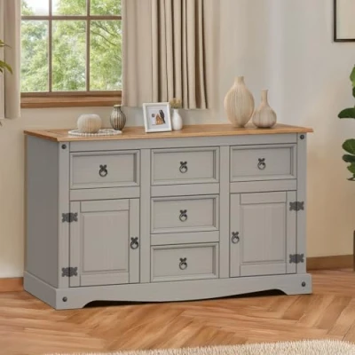 General description The Corona Grey Wax Large Sideboard features a subtle grey wash body that showcases the natural grains and textures of the wood, providing a modern twist on a classic design. Crafted from solid pine and hand waxed, it protects and enhances the wood's grain while retaining the beloved characteristics of the Corona range. With 2 doors and 5 drawers, this sideboard offers ample storage space, making it a valuable addition to any home. The decorative metal fittings add a distinctive Mexican styling, contributing to its warm rustic country charm. Technical specifications Height: 76 cm Width: 125 cm Depth: 40 cm Material: Solid pine with hand wax finish Backs and drawer bases: Hardboard Installation The sideboard is delivered flat packed for easy home assembly, complete with step-by-step instructions.