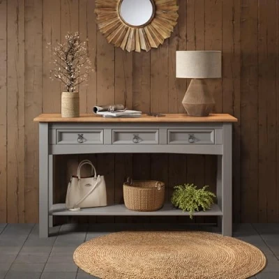 General description The Corona Grey Wax 3 Drawer Console Table features a subtle grey wash body that showcases the natural grains and textures of the wood, offering a modern twist on a classic design while retaining the beloved characteristics of the Corona range. Expertly crafted from solid pine and hand waxed, this table is designed to protect, preserve, and enhance the wood grain. With three drawers for storage, it provides outstanding value and is a welcome addition to any home. Decorative metal fittings add distinctive Mexican styling, contributing to its warm rustic country charm. Technical specifications Height: 73 cm Width: 122 cm Depth: 32 cm Installation The console table is delivered flat packed for easy home assembly, complete with step-by-step instructions.