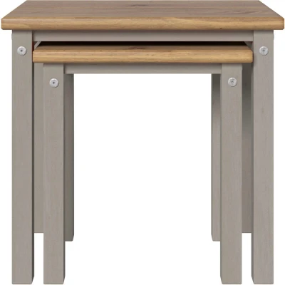General description Useful set of 2 tables which can be used independently or nested to save space. Featuring a grey waxed finish underframe with antique waxed pine tops that have a plank effect. Technical specifications Dimensions: L35 x W53 x H51.1 cm Weight: 11.5 kg Material: Solid Pine with grey wash wax frame and antique wax tops Assembly: Steel assembly bolts for strength and stability Assembly fitting: Allen key supplied