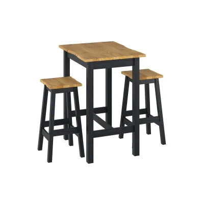 General description This small rectangular high breakfast bar table and pair of bar stools set is perfect for dining areas where space is limited. Made from responsibly sourced timber, it features a modern look with a contrasting black wax and antique wax finish. The rustic live natural wavy edge on either side of the table adds character to any room. Technical specifications Table dimensions: L80 x W60 x H101.5 cm Stool dimensions: L37.8 x W37.8 x H72.9 cm Weight: 28 kg Other information Natural live edge design Made from responsibly sourced pine Black metal hardware Easy to clean Tools for assembly: Screwdriver Additional stools available for purchase