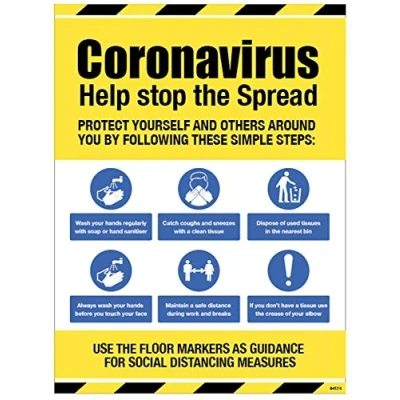 Safety sign to help display and advise of steps to take to mininmise the impact of coronavirus. Use as part of your workplace control measures during the COVID19 outbreak High quality print on glossy white, rigid PVC Waterproof - suitable for indoor and outdoor locations Lightweight with high impact strength, easily drilled for fixing Self-extinguishing material prevents the ignition of flames & flame spread