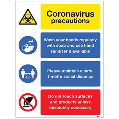 Safety sign to help display and advise of steps to take to mininmise the impact of coronavirus. Use as part of your workplace control measures during the COVID19 outbreak High quality print on glossy white, rigid PVC Waterproof - suitable for indoor and outdoor locations Lightweight with high impact strength, easily drilled for fixing Self-extinguishing material prevents the ignition of flames & flame spread