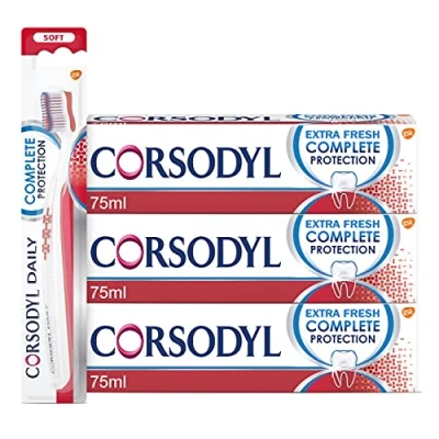 3X TOOTHPASTE & 1X TOOTHBRUSH: The bundle includes 3x Corsodyl Complete Protection Extra Fresh Toothpaste 75ml and 1x Corsodyl Soft Toothbrush Corsodyl Complete Protection Extra Fresh Toothpaste has 8 specially designed benefits for healthy gums & strong teeth: reduces bleeding and inflamed gums, removes plaque bacteria, tightens the gum seal, freshens breath, strengthens enamel, deep cleans & gently whitens. HELP STOP BLEEDING GUMS: Healthy teeth start with healthy gums. If you see traces of blood when brushing or flossing, this can be a sign of gum disease. Bleeding gums can be caused by the build-up of plaque bacteria along the gum line. Corsodyl Complete Protection Toothpaste is 4x more effective at removing plaque than a regular toothpaste. FRESH BREATH AND TASTE: Corsodyl Complete Protection toothpaste has a unique formulation that provides a deep clean & gently whitens. It leaves your mouth feeling clean and fresh. SPECIALLY DESIGNED TOOTHBRUSH: Corsodyl Soft toothbrush is designed to provide effective cleaning in hard-to-reach areas*. *With twice daily brushing. *Helps restore natural whiteness with twice daily brushing.