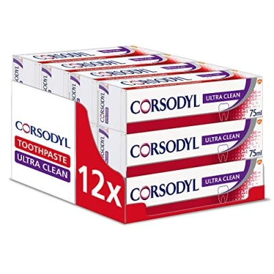 PACK OF 12: Contains 12 Corsodyl Ultraclean toothpaste 75 ml units for a long term supply of Corsodyl Toothpaste at amazing value and is delivered in original manufacturer casing. This gives you the tools to fight bleeding gums over a longer period of time MAINTAIN HEALTHY GUMS: Corsodyl Ultra Clean is a daily fluoride toothpaste for healthy gums that is clinically proven to help stop and prevent bleeding gums STOP BLEEDING GUMS: Bleeding gums can be caused by the build up of plaque bacteria along the gum line. Corsdoyl is 4x more effective at removing this plaque than a regular toothpaste. If not removed, plaque can cause inflammation and if left untreated, can cause the gum to recede and eventually, tooth loss FRESH BREATH AND TASTE: Corsodyl Ultra Clean toothpaste is suitable for daily use as it strengthens teeth and freshens breath. Corsodyl toothpaste has a unique formulation that gives it a therapeutic taste. After brushing, gums feel healthy and teeth feel ultra clean