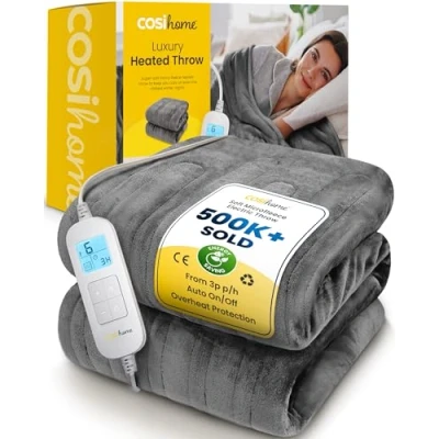 LUXURY MICRO FLEECE: This Cosi Home Heated throw is made with a warm and fluffy micro-fleece fabric, this double-sided and soft-touch electric heated throw is perfect for keeping you cosy on the sofa, settee or in bed and on both freezing cold winter nights and warmer summer days. Running cost as low as 3p per hour (October 2024). 10-HR TIMER & 10 HEAT SETTINGS: A 10-Hour programmable timer function with an automatic cut-off feature allows the throw to turn off after a desired period of time. Perfect for when you fall asleep or if you forget to unplug your heated blanket. 10 adjustable heat settings provide complete temperature control for unrivalled comfort, whatever the weather. SLIM & EASY-TO-USE REMOTE: Each heated blanket throw comes with an upgraded, easy-to-use remote. The slim and compact design features large soft-touch buttons and a modern digital screen, ensuring effortless operation for every family member. MAKE HOLIDAYS WARMER: Are you looking for last-minute Christmas gifts? Our fluffy blankets make excellent Christmas gifts for women, men or even children. Cosy, warm and stylish, everyone will want to snuggle with a Cosi Home Christmas blanket this holiday season. EXTRA LARGE & WARM: Large enough for 2 adults, this 160x130cm heated throw blanket allows you and another person (or alone) to wrap yourselves up and stay warm and is even large enough to cover your feet. Integrated heating elements woven into the soft-touch fabric deliver consistent consistent and efficient heat, perfect for relaxing or soothing aching muscles and joints. MACHINE WASHABLE & DURABLE: Our electric heated throw is 100% machine washable for your convenience. The remote control and cable are fully detachable, allowing this versatile heated throw to be washed over and over again, ensuring the fabric remains clean and fresh for many years. ADVANCED SAFETY FEATURES: With any heating device, safety is of paramount importance. That is why all Cosi Home heated throws and electric blankets feature an advanced overheat protection system and are fully CE compliant with UK & European regulations.