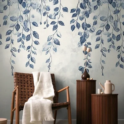 A cascade of leaves in deep blue from the ceiling height trailing down an off white cloud effect background. The design is repeatable left to right if required. Supplied on a roll 53 cm or 20.8 inches wide.