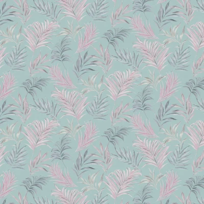 WallpaperDirectA lightly textured vinyl wallcovering with an all over random pattern of feathery, curving palm leaves. Shown in the sky blue and mauve colourway.