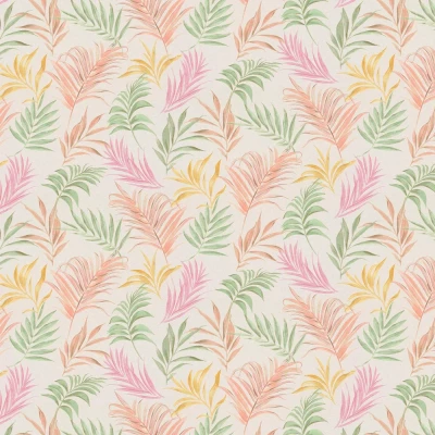 WallpaperDirectA lightly textured vinyl wallcovering with an all over random pattern of feathery, curving palm leaves. Shown in the pastel colourway with mint, pink and yellow.