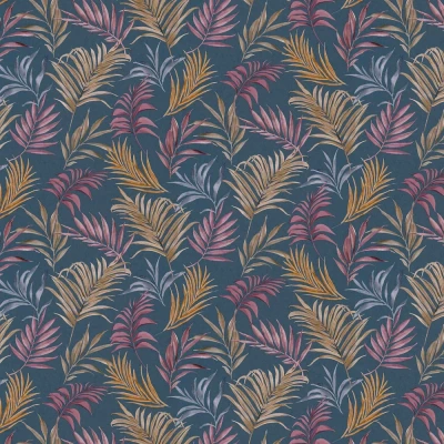 WallpaperDirectA lightly textured vinyl wallcovering with an all over random pattern of feathery, curving palm leaves. Mauve, green and gold leaves on a deep blue background.