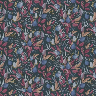 WallpaperDirectA lightly textured vinyl wallcovering with an all over stylised floral pattern of buds, half open flowers and seed heads with spiky leaves. Shown in the mauve and blues on a deep midnight blue background.