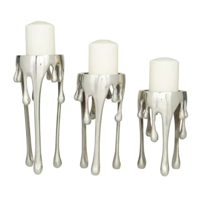 CONTEMPORARY THEME: A contemporary style offers neutral elements and basics form with a bold design MADE WITH ALUMINUM: Shaped and molded from beautiful aluminum materials SILVER FINISH: Shows off a polished and glossy silver finish FEATURES ROUND CANDLE HOLDER: Features an interesting melting and dripping metal design SMALL SIZE: Each item measures 5"L x 5"W x 12"H, 5"L x 5"W x 10"H, 5"L x 5"W x 8"H and weighs 5 lbs