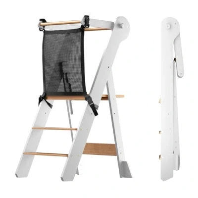 COSYLAND Foldable Toddler Standing Tower with Safety Net Height Adjustable Folding Kid Kitchen Step Stool Helper for Learning and Cooking Ages 18 Months to 6 Years (Natural & White)
