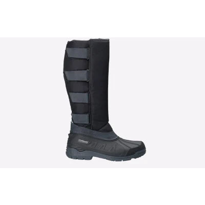 Windproof and waterproof mens hybrid winter yard boot with wide adjustable fit touch-fasten thermo uppers and robust practical chunky rubber galosh non-slip sole. Padded top to toe with microfiber faux sheering keeping feet warm in cold conditions. - Mens knee-length hybrid winter country yard boot- Durable lightweight and breathable textile upper - Waterproof moulded thermoplastic rubber galosh - Five flexible wide calf fit adjustable touch fasten straps - Extra wide full-length windproof gusset - Top to toe microfiber fleece faux sheering lining