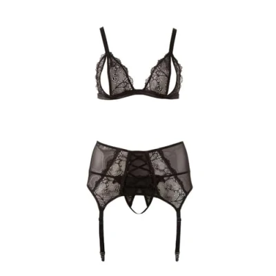 Set consisting of flowery lace Soft bra with open cups Adjustable straps and hook closure in the back Suspender belt with decorative lacing Matching string enclosed