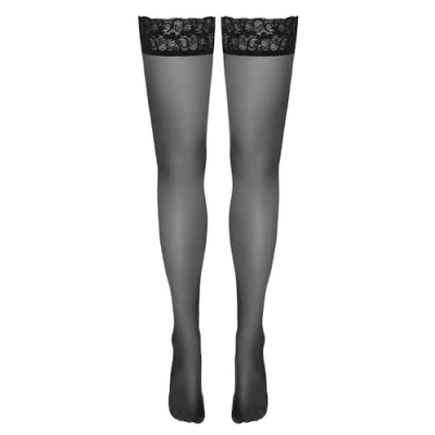 6 cm wide lace trim Silicone inside for non-slip fit Yarn thickness 20 den Oeko-Tex certified