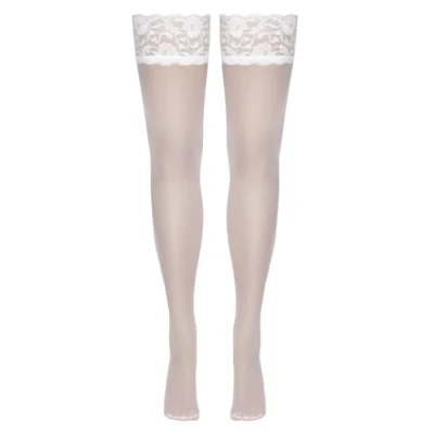 9 cm wide lace trim Silicone inside for non-slip fit Yarn thickness 20 den Oeko-Tex certified