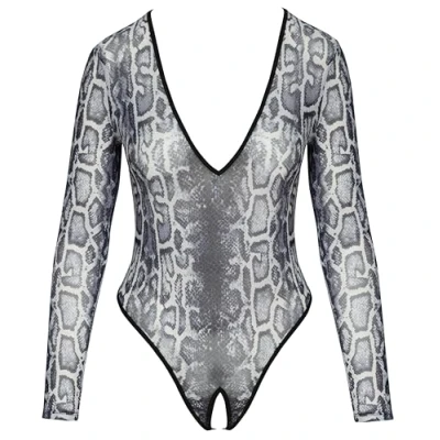 Crotchless body in a snakeskin look Transparent made of fine powernet Thong style with a plunging neckline Extra-high leg cut-outs