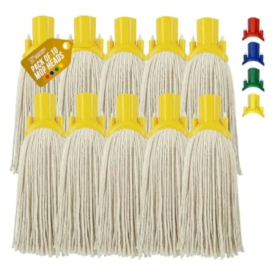 Cotton Floor Mop Heads Replacement Absorbent for Colour Coded Mops Cleaning Floors Durable Plastic & Self Threading Head Available in Blue, Green, Red, Yellow Pack of 10