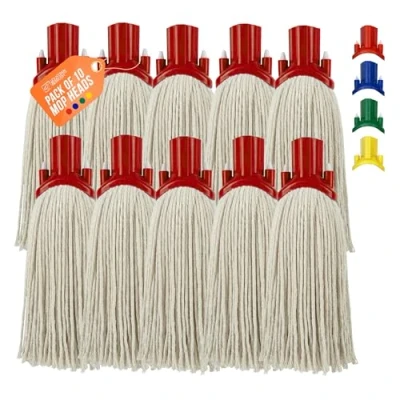 Colour Coded Cotton Mop Replacement Heads - Our mop heads replacement collection includes 10 absorbent cotton mop heads in blue, green, red, and yellow. These color-coded floor cleaner mop heads are ideal for hygienic cleaning in restaurants, hotels, and homes, ensuring an efficient cleaning process. Absorbent Pure Cotton Strands - Each refill floor mops for laminate floors is crafted with pure cotton strands designed for maximum absorption, making our floor mops for hard floor surfaces highly effective. These floor mop heads offer exceptional drying power, perfect for maintaining a spotless environment. Durable Plastic Handle Slot - Our mop heads feature a robust plastic handle slot, ensuring longevity and compatibility with most mop handles. This design facilitates seamless integration with your existing cleaning tools, enhancing your household wet & dry mops experience. Self Threading Socket - The innovative self-threading socket allows for easy attachment to dry mop handle, providing a hassle-free setup for your cleaning mops for floors. This user-friendly feature streamlines the process for both professional and home cleaning tasks. Versatile Usage - These microfiber mop heads are ideal for various applications, including use as a bathroom mop or kitchen mop, and effective on both laminate floors and tiled surfaces. Suitable for refill kitchen mops for cleaning floors without bucket, they ensure pristine cleaning results in diverse settings.