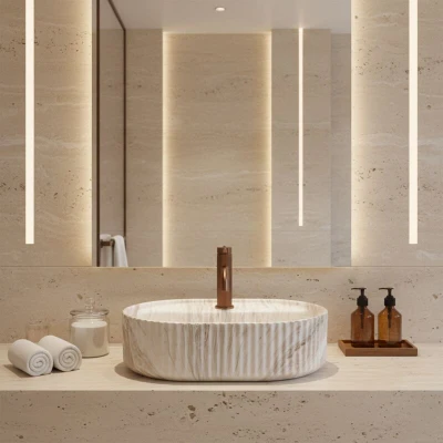 The Rea Marcela 50 countertop washbasin in Kallisto finish is the ideal choice for those who want to bring a light and elegant touch to their bathroom with a natural stone effect, in a more expressive and veined version. The creamy white base is enhanced with warm beige and caramel hues, arranged in soft layers that add a feeling of comfort and a premium feel. This palette blends perfectly with wood, light-colored countertops, sintered surfaces in sand tones, and contrasting faucets in black, graphite, or copper tones. The shape is eye-catching thanks to the characteristic vertical fluting on the exterior wall, which emphasizes the design of the model and gives the washbasin the look of a refined decorative element. Inside, the basin remains smooth and comfortably contoured, making daily use and cleaning easy. The sanitary ceramic offers a pleasing and elegant finish, while the Kallisto pattern—with its natural tonal transitions and subtle veining—creates an impression of depth and a