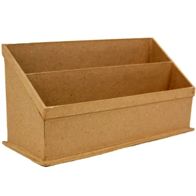 Letter rack with two compartments in Papier Mache 26.5cm x 10.5cm x 13cm high at the back, 7cm high at the front Ready to paint or decorate with a variety of materials Made from 100% recycled materials and organic glue Part of a range of Paper Mache shapes
