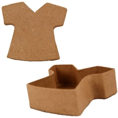 T-Shirt shaped box in Papier Mache 9cm x 8cm x 3cm Ready to paint or decorate with a variety of materials Made from 100% recycled materials and organic glue Part of a range of Paper Mache shapes