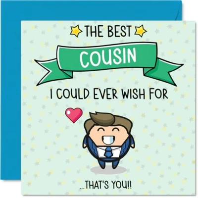 MAKE YOUR COUSIN SMILE WITH THIS UNIQUE BIRTHDAY CARD: This exceptional quality Cousin birthday card for him shows the design 'The Best Cousin I Could Ever Wish For? That?s You!!'. If you are looking for an awesome birthday card Cousin for him, then then this happy birthday Cousin card is bound to make him smile. Not just a birthday card for Cousin this could also be a birthday gifts for Cousin, Family or Relative. WHAT DO YOU GET: The card is printed on one side and BLANK ON THE INSIDE to allow you to write your very own message. The unique fun design is printed on a specially sourced and environmentally responsible board. At 360 microns thick the natural white one-sided gloss board has a quality look and feel. Supplied with a coloured gummed envelope to complement the design and ready to be sealed and sent in the post. Great Cousin birthday cards, Family birthday card. NO INK SMUDGES: There is nothing worse than writing inside a card to find that the shiny surface makes the ink smudge. This is why we use a high quality one sided coated board. The uncoated side will absorb more of the ink from your pen to make smudging a thing of the past. Cousin birthday cards, Cousin birthday cards from Family. SIZES: Greeting Card = 145mm x 145mm, Envelope = 155mm x 155mm, Card Thickness = 360 micron. Happy birthday Cousin, Cousins birthday card, Cousin cards birthday, birthday card Cousin, happy birthday Cousin card, Cousin gifts from Family. MADE AND QUALITY CHECKED IN THE UK: We print and manufacture all our products right here in the UK so you can be sure of a fast turnaround and a product that is expertly made. Using environmentally responsible premium board our card is conscious of the responsible management of the world's forests - happy birthday card Cousin, Cousin birthday cards.