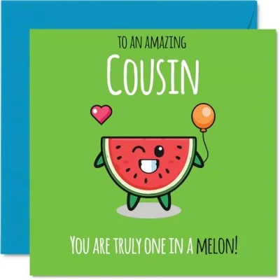 MAKE YOUR COUSIN SMILE WITH THIS UNIQUE BIRTHDAY CARD: This exceptional quality Cousin birthday card shows the design 'To An Amazing Cousin You Are Truly One In A Melon!'. If you are looking for an awesome birthday card for Cousin, then then this happy birthday Cousin card is bound to make them smile. Not just a birthday card for Cousin this could also be a birthday gifts for Cousin, Family or Relative. WHAT DO YOU GET: The card is printed on one side and BLANK ON THE INSIDE to allow you to write your very own message. The unique fun design is printed on a specially sourced and environmentally responsible board. At 360 microns thick the natural white one-sided gloss board has a quality look and feel. Supplied with a coloured gummed envelope to complement the design and ready to be sealed and sent in the post. Great Cousin birthday cards, Family birthday card. NO INK SMUDGES: There is nothing worse than writing inside a card to find that the shiny surface makes the ink smudge. This is why we use a high quality one sided coated board. The uncoated side will absorb more of the ink from your pen to make smudging a thing of the past. Cousin birthday cards, Cousin birthday cards from Family. SIZES: Greeting Card = 145mm x 145mm, Envelope = 155mm x 155mm, Card Thickness = 360 micron. Happy birthday Cousin, Cousins birthday card, Cousin cards birthday, birthday card Cousin, happy birthday Cousin card, Cousin gifts from Family. MADE AND QUALITY CHECKED IN THE UK: We print and manufacture all our products right here in the UK so you can be sure of a fast turnaround and a product that is expertly made. Using environmentally responsible premium board our card is conscious of the responsible management of the world's forests - happy birthday card Cousin, Cousin birthday cards.