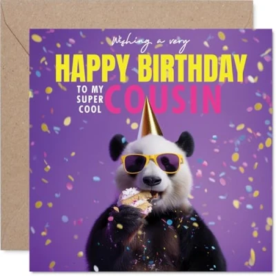Cousin Birthday Card Pandastic Cake Happy for from Family Relative, 145mm funny panda Bday Greeting Cards