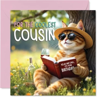 MAKE YOUR COUSIN SMILE WITH THIS UNIQUE BIRTHDAY CARD: This exceptional quality Cousin birthday card shows the design 'For the coolest Cousin Relax and chill its your birthday'. If you are looking for an awesome birthday card for Cousin, then then this happy birthday Cousin card is bound to make them smile. Not just a birthday card for Cousin this could also be a birthday gifts for Cousin, Family or Relative. WHAT DO YOU GET: The cards are printed on both sides with the inside print saying 'Have a Great Day' and ample space for your own personal message. The unique fun design is printed on a specially sourced and environmentally responsible board. At 360 microns thick the natural white one-sided gloss board has a quality look and feel. Supplied with a coloured gummed envelope to complement the design and ready to be sealed and sent in the post. NO INK SMUDGES: There is nothing worse than writing inside a card to find that the shiny surface makes the ink smudge. This is why we use a high quality one sided coated board. The uncoated side will absorb more of the ink from your pen to make smudging a thing of the past. Cousin birthday cards, Cousin birthday cards from Family. SIZES: Greeting Card = 145mm x 145mm, Envelope = 155mm x 155mm, Card Thickness = 360 micron. Happy birthday Cousin, Cousins birthday card, Cousin cards birthday, birthday card Cousin, happy birthday Cousin card, Cousin gifts from Family. MADE AND QUALITY CHECKED IN THE UK: We print and manufacture all our products right here in the UK so you can be sure of a fast turnaround and a product that is expertly made. Using environmentally responsible premium board our card is conscious of the responsible management of the world's forests - happy birthday card Cousin, Cousin birthday cards.
