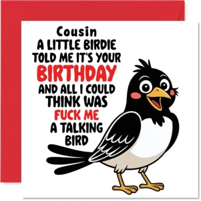 MAKE YOUR COUSIN SMILE WITH THIS UNIQUE BIRTHDAY CARD: This exceptional quality Cousin birthday card shows the design 'Cousin A little birdie told me its your birthday and all I could think was fuck me a talking bird'. If you are looking for an awesome birthday card for Cousin, then then this happy birthday Cousin card is bound to make them smile. Not just a birthday card for Cousin this could also be a birthday gifts for Cousin, Family or Relative. WHAT DO YOU GET: The card is printed on one side and BLANK ON THE INSIDE to allow you to write your very own message. The unique fun design is printed on a specially sourced and environmentally responsible board. At 360 microns thick the natural white one-sided gloss board has a quality look and feel. Supplied with a coloured gummed envelope to complement the design and ready to be sealed and sent in the post. Great Cousin birthday cards, Family birthday card. NO INK SMUDGES: There is nothing worse than writing inside a card to find that the shiny surface makes the ink smudge. This is why we use a high quality one sided coated board. The uncoated side will absorb more of the ink from your pen to make smudging a thing of the past. Cousin birthday cards, Cousin birthday cards from Family. SIZES: Greeting Card = 145mm x 145mm, Envelope = 155mm x 155mm, Card Thickness = 360 micron. Happy birthday Cousin, Cousins birthday card, Cousin cards birthday, birthday card Cousin, happy birthday Cousin card, Cousin gifts from Family. MADE AND QUALITY CHECKED IN THE UK: We print and manufacture all our products right here in the UK so you can be sure of a fast turnaround and a product that is expertly made. Using environmentally responsible premium board our card is conscious of the responsible management of the world's forests - happy birthday card Cousin, Cousin birthday cards.