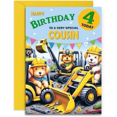 Cousin Kids 4th Birthday Card Doggy Digger Crane Design for Age 4 Boy A5 Size with Yellow Envelope