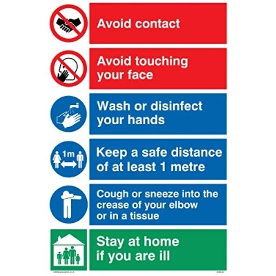 This safety sign is part of a range of over 40,000 matching signs. This sign is made from plastic semi-rigid 1mm material Sign Text: Avoid contact. Avoid touching your face. Wash or disinfect your hands. Keep a safe distance of at least 1 metre. Cough or sneeze into the crease of your elbow or in a tissue. Stay at home if you are ill. Country of origin:United Kingdom