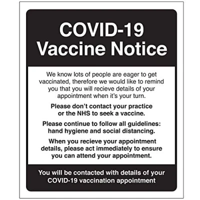 Self adhesive safety label to help display and advise of steps to take to minimise the impact of coronavirus during vaccination and testing programmes. Ideal to display important information to visitors for their COVID19 vaccinations. High quality print on glossy white, flexible vinyl with a strong, permanent, self-adhesive backing Suitable for application to most smooth, dry and clean surfaces, best used indoors Always thoroughly clean and dry the surface before application for best adhesion Simply peel off the protective backing, position and apply firmly to the surface