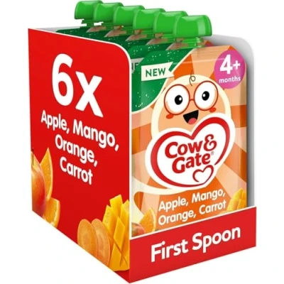 Cow & Gate Fruit Pouch Apple Mango Orange Carrot Baby Food Snack, 4+ Months, 100g (Pack of 6)