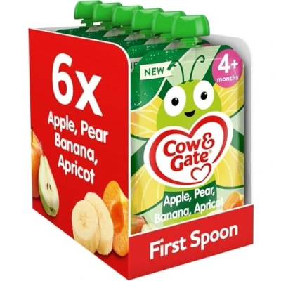 Cow & Gate Fruit Pouch Apple Pear Banana Apricot Baby Food Snacks, 4+ Months, 100g (Pack of 6)