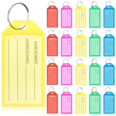 Easy Identification: You will receive 40 pcs plastic colored key tags (blue, green, yellow, purple, red - 8 pieces per color). The transparent lid is water and dust resistant, allowing you to see the contents clearly. Ideal for organizing keys, name key rings or similar items in your home or office DURABLE AND DURABLE - Made of PP plastic, paper and metal, these key tags are shockproof, oil resistant and lightweight (3.5g). Size: 5.5 x 2.8 cm. The included paper is writable and the metal will not rust. No smell, fading or deterioration over time Customizable Information: Write what you want on key tags, such as names, numbers, symbols or messages. Perfect for making custom label keyrings quickly and easily EASY TO USE - Snap on design makes these key tags practical - press the lid to open it without removing the metal ring. Replace or edit paper in seconds WIDELY USABLE - Great for plastic key tags tag, labeling backpacks, lunch boxes, keys, luggage, USB, baby or pet items. A great solution for organizing and identifying any item!