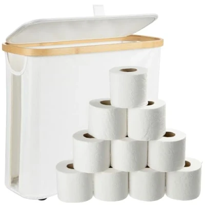 Spacious storage basket for your bathroom: our toilet paper storage basket offers plenty of space for 9-12 rolls of toilet paper with its dimensions of 43 x 35 x 17 cm and a capacity of 25 litres. With this practical bathroom organiser, you can always keep your bathroom tidy and at hand. No more mess - enjoy a perfectly organised bathroom! ✅[High Quality Materials for Durability]:This storage basket with lid is made of elegant bamboo frame, waterproof oxford cloth and integrated fabric lid. The bamboo is smooth and splinter free, while the sturdy oxford fabric is durable and abrasion resistant. The lightweight fabric lid protects against dust and makes storage easier. With the side handles, the basket can be easily moved and placed anywhere. ✅[EASY ASSEMBLY & SPACE SAVING STORAGE]: The bathroom storage basket is tool-free and assembled in just one minute. Simply press the four bamboo strips into the frame and attach them with Velcro fasteners. The basket is sturdy yet compact and can be stored in tight bathrooms to save space. When not in use, it can be easily folded and stored. ✅[MULTIPURPOSE ALL THE HOUSE]: Our storage basket is ideal for small bathrooms, yet still offers enough space for regular or double toilet paper rolls. In addition, it is perfect for organising other bathroom essentials such as hygiene items, magazines or accessories. With its multifunctional design, it is the perfect storage box for the bathroom. ✅[CUSTOMER SATISFACTION GUARANTEED]: You will receive a high quality toilet paper storage basket from Cozary. We offer first-class customer service and are available to you within 24 hours if you have any questions or concerns. Take advantage of our worry-free return and exchange policy - for an all-round safe shopping experience!