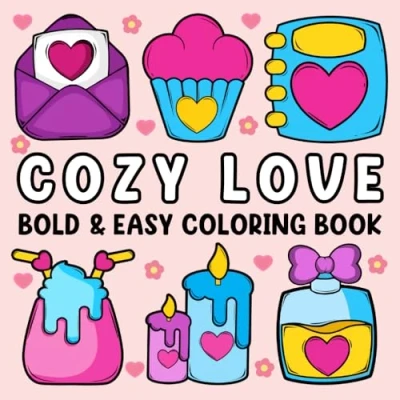 Cozy Love Bold and Easy Coloring Book: Simple Cute Designs for Adults Kids with Illustrations of Themed Foods, Sweets, Flowers, Lovebirds, More