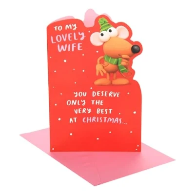You are viewing: A Christmas Greeting Card Occasion: Perfect for Christmas celebrations. Details: This pop-out funny card has been thoughtfully designed as part of the Crackers range by UK Greetings. It features a cheeky googly eyed cartoon mouse wearing a stripy green scarf and matching bobble hat with the caption 'To My Lovely Wife you deserve only the very best at Christmas…' on the front and '…that's why you've got ME!' on the inside. Good to know: This funny card is made from sustainable forests and recyclable card. It comes with a red envelope and is packaging free. Size: 15cm x 23cm or 6" x 9"