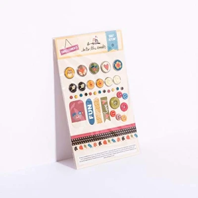 Into The Woods Collection Embellishment Set 37pcs 7 assorted buttons, 11 assorted decorative brads, 12 assorted plain coloured brads, 4 decorative paper embellishments, 3 assorted ribbons (33cm long) Perfect designs for cardmaking and scrapbooking.