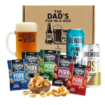 Craft Beer & Snacks Set for Fathers Day Ipa Lager 2 x 440ml, Decorated Dad's Beers Glass Randomly Selected 5 Flavour Pork Scratchings. Christmas Gifts Men, Unique Birthday