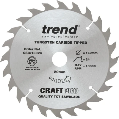 General description The Trend CSB/16024 Craft saw blade is a high-quality circular saw blade designed for a professional finish. It is suitable for cutting various materials including soft wood, hard wood, plywood, soft fibre, plasterboard, stone, fibre board, cement bonded board, and particle board. Technical specifications Diameter: 160 mm Teeth: 24 Bore: 20 mm Material: Tungsten Carbide Tipped Body: High grade alloy steel plate, precision ground Other information Reamed bore for precise fit to spindle Silverbraze bonding for secure tip attachment Body hardened and tempered for trueness Laser etched on reverse to European standard EN847-1/2 Microgranular Tungsten Carbide Tipped for cutting abrasive materials Trend name for traceability and quality guarantee