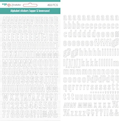 DESCRIPTION: Craftelier Basics self-adhesive alphabet stickers, an ideal addition to decorating scrapbooking and craft projects with the ability to add titles and personal details. DETAILS: Contains uppercase and lowercase letters, numbers and special characters. The pack contains a total of 489 pieces, distributed over 3 sheets (two sheets with uppercase letters and one with lowercase letters). The approximate size of the capital letters is 1.48 x 0.80 cm and the lower case 1.00 x 0.70 cm. The stickers are white. What is scrapbooking? : It is an artisanal discipline based on capturing memories, feelings or important events. The essence of scrapbooking is to tell a story, and it is based on two key elements: the photo and the memory that surrounds it. Photos are used and decorated with patterned paper, ribbons, cardstock, washi tape, stamps and other embellishments. It can be made on albums, notebooks, cards, diaries and planners. Who we are? : The Craftelier brand specialises in materials and tools for scrapbooking and other crafts. Our tools and materials are both stylish and practical, because we attach great importance to design. Discover all the products that allow you to master the art of paper crafting in our Amazon shop. CUSTOMER SERVICE We are experts and have a passion for scrapbooking, crafts and arts in general. We are at your disposal to solve all your doubts and questions about our products. We are happy to help you with the customer service we have available through Amazon's internal messaging system., Manufacturer: Craftelier