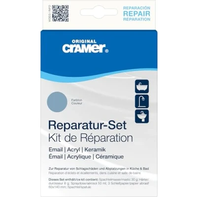 Effective repair small damage: eliminate chips and impact damage up to 25 mm with our repair kit quickly and easily - for a flawless bathroom. Save time and money with a sustainable solution that lasts! Simple and reliable. For all shower trays, bathtubs, sinks and sinks made of enamel, acrylic and ceramic (porcelain). Contains no epoxy resin = fade resistant and does not yellow. Styrene-free. Trust in quality "Made in Germany" since 1972. Complete Kit Contents: The kit contains repair material for seven average damages: 2-component filler 30 g, hardener 8 g, aerosol repair varnish 50 ml in sanitary colour, spatula & abrasive (brown for enamel, grey for acrylic). The ideal pack size for your home! Important notes and limitations: Designed for spot repair of chips on ceramic, enamel and acrylic. The surface must be load-bearing. Heat resistant up to 60°C. Not suitable for cracks, overpainting unsightly surfaces and for dirt-repellent easy-to-clean surfaces. Not food safe - do not use on cookers, cookware or food contact. TUV approved quality for professional results. Meets the highest standards. Precise, colour-true repair of impact damage to bathtubs and sinks. Trust in our industrial quality - for results like the professional Experience counts: Original Cramer - your expert since 1972. Benefit from over 50 years of expertise in developing innovative products to care, repair and protect your bathroom surfaces. Rely on quality: trust in our competence - because your satisfaction is our driving force!, Weight: 0.34833037396 pounds, Manufacturer: Cramer