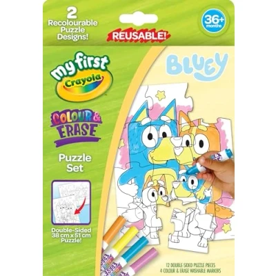 Double-sided colourable puzzle pieces Colour, wipe off and re-colour again! Great for hand-eye coordination Bluey themed, Manufacturer: Vivid Toy Group