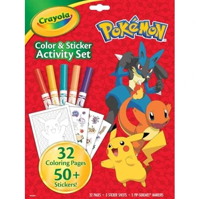 POKÉMON ACTIVITY SET:Features 32 Pokémon Coloring Pages, 5 Crayola Pipsqueak Markers, and 50+ Stickers of Ash, Pikachu, Sobble, and friends. TRAVEL ACTIVITIES FOR KIDS: Let little ones color & sticker when on the go or at home. LOOSE COLORING PAGES: These loose coloring pages make it easy for kids to share and display their favorite Pokémon characters. No tearing necessary! Keep the adventurous coloring pages safe and organized in their folder-style packaging. BEYOND COLORING: Pokémon stickers make coloring fun even more immersive, and moving beyond the page, kids will also love using them to decorate journals, pencil cases, or even their own tshirts.